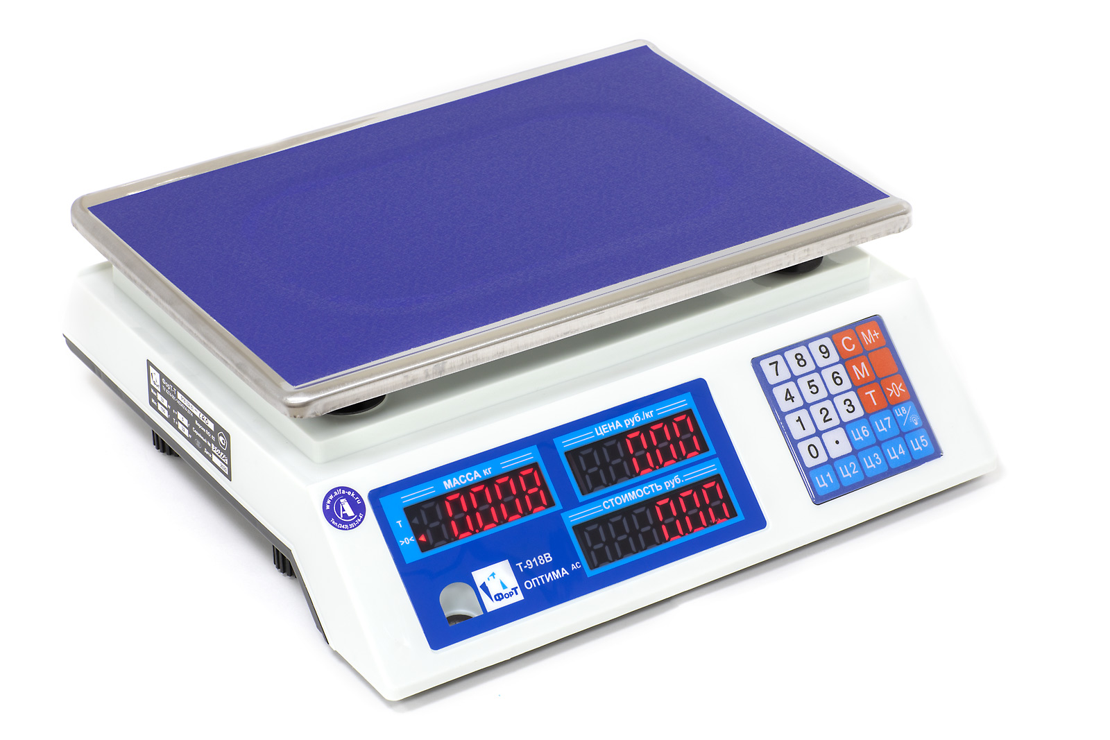 ФорТ-Т 918 ОПТИМА НПВ=15кг, НмПВ=0,04г, d=e=2г. LED дисплеи продавца и покупателя: масса, цена, стоимость. Без стойки. Платформа 230х330 мм нержавейка. Питание от сети + АКБ.